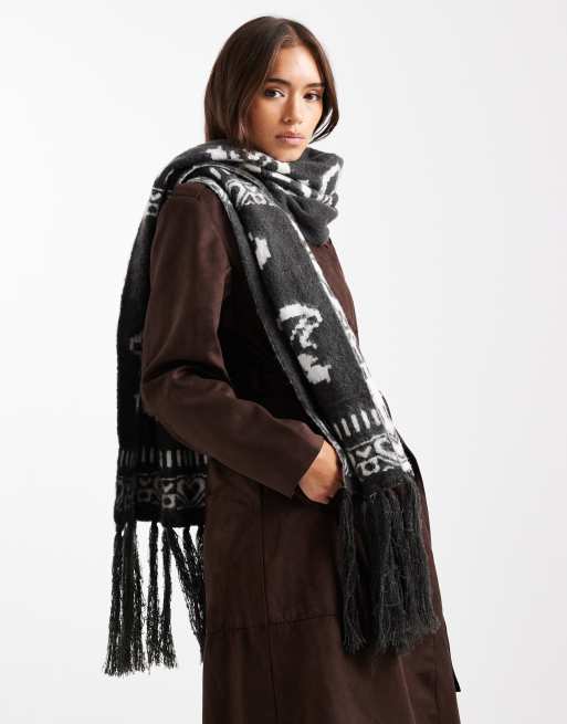 Daisy Street intarsia scarf with tassels in warm charcoal