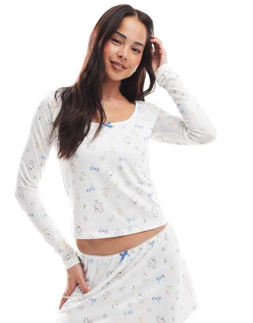Daisy Street long sleeve pyjama top with bow graphic detail in white