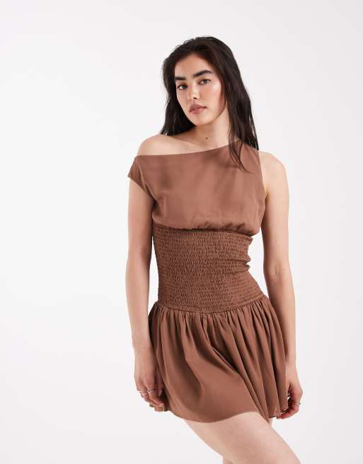 Daisy Street off the shoulder boho georgette shirred detail mini dress in brown