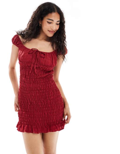 Daisy Street shirred milkmaid style mini dress with frilled hem in red