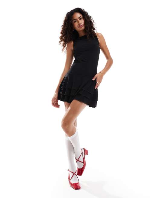 Daisy Street slash neck ruffle hem mini dress in black
