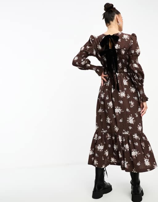 Damson Madder ruby chintz floral print midi dress in chocolate