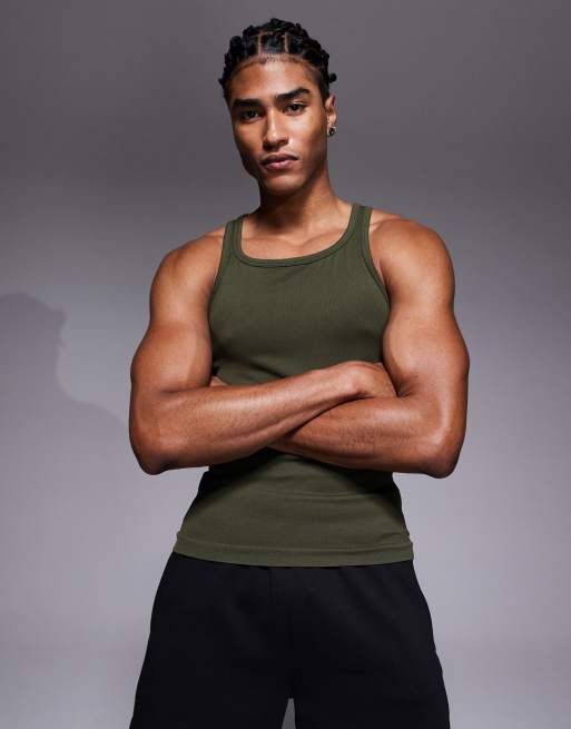 4505 – Nahtloses, geripptes Slim Fit Sport-Trägershirt in Khaki mit eckigem Ausschnitt