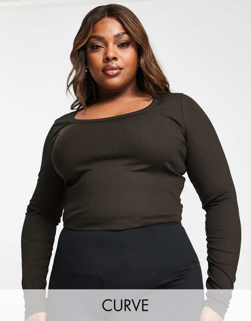 ASOS 4505 Curve – Langärmliges, geripptes Sport-Oberteil in Braun