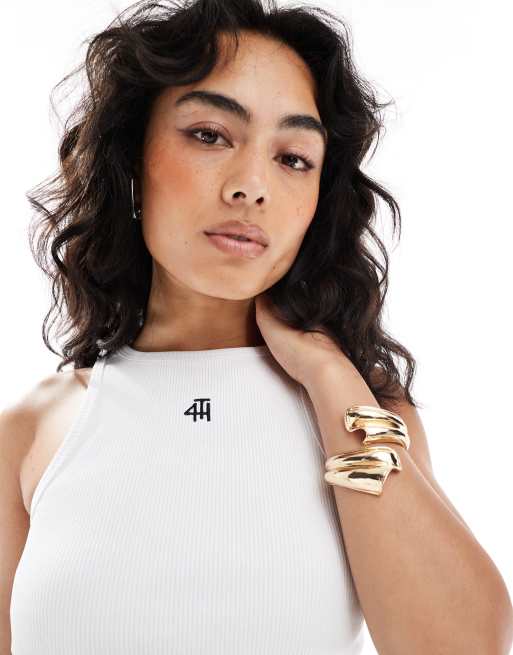 4th & Reckless – Geripptes Trägertop in Weiß mit Logo-Stickerei