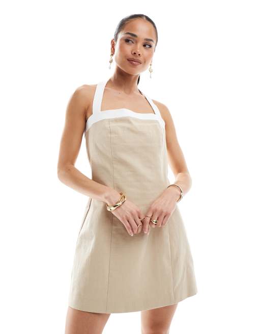 4th & Reckless – Minikleid in beiger Leinenoptik mit Kontrastkante und Neckholder