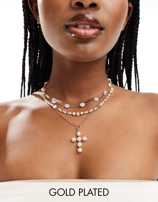 8 Other Reasons – Vergoldete, mehrreihige Halskette mit Kreuzanhänger und Perlenbesatz