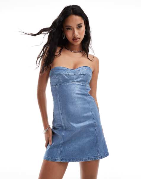 ASOS DESIGN – Trägerloses Denim-Oberteil in Indigoblau mit asymmetrischen Ziernähten
