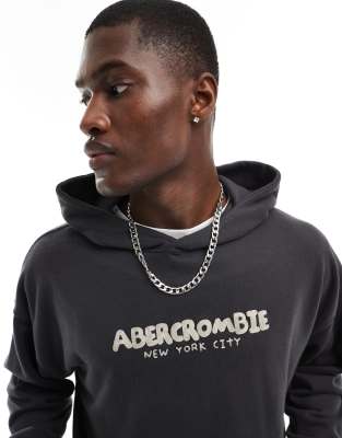 Abercrombie & Fitch – Kapuzenpullover aus Sommersweat in verwaschenem Schwarz mit Kettenstich gesticktem Logo