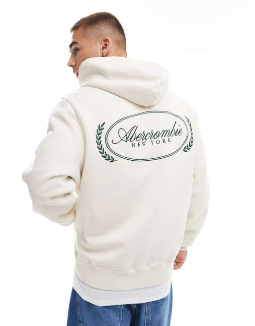 Abercrombie & Fitch – Kapuzenpullover in Creme mit Logo-Schriftzug und Rückenstickerei