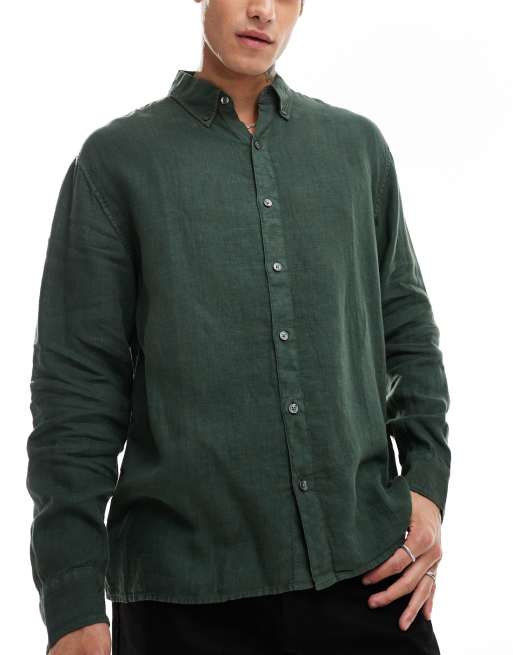 Abercrombie & Fitch – Langärmliges Leinenhemd in Dunkelgrün