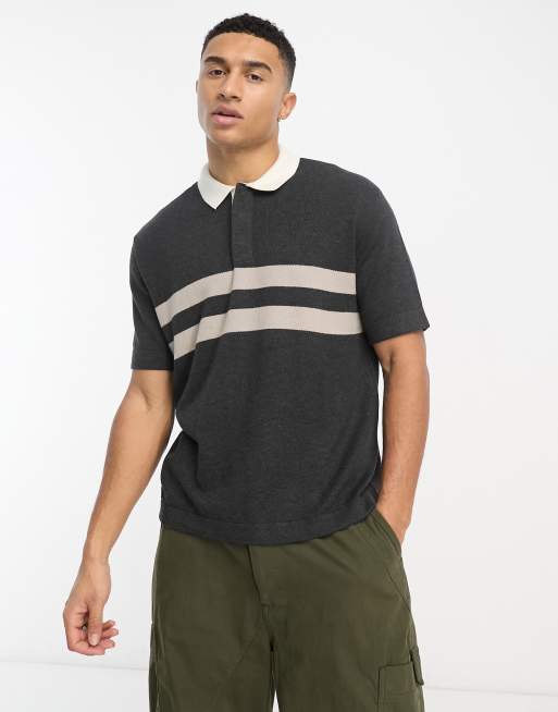 Abercrombie & Fitch – Oversize-Polohemd aus schwarzem Strick mit Streifen auf der Brust