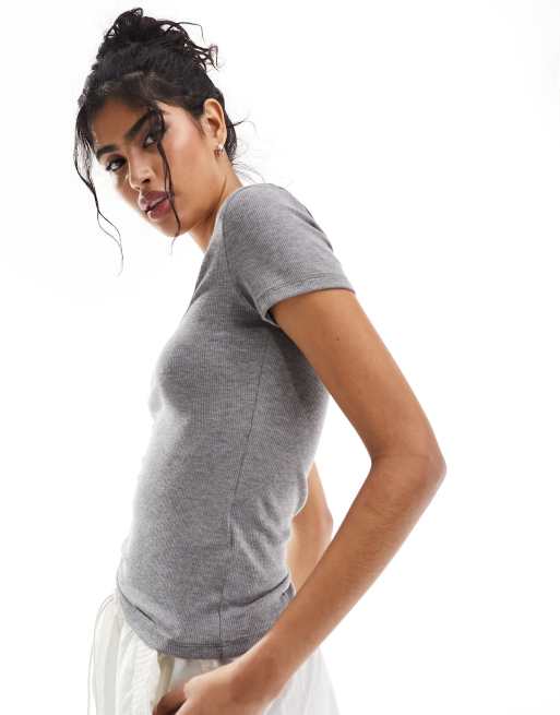 Abercrombie & Fitch – Weiches, geripptes T-Shirt in Grau mit eckigem Ausschnitt