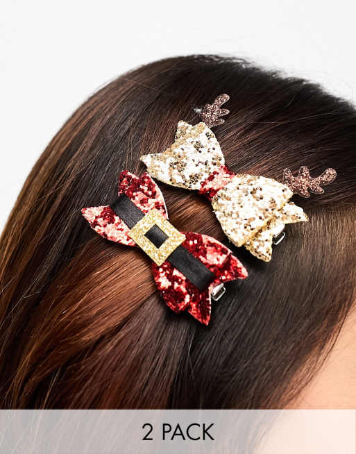 Accessorize – 2er-Pack Weihnachtshaarspangen mit glitzernder Schleife in Rot und Goldoptik