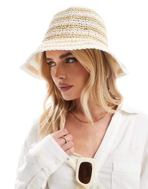Accessorize – Gestreifter Anglerhut aus Stroh in Weiß/Natur