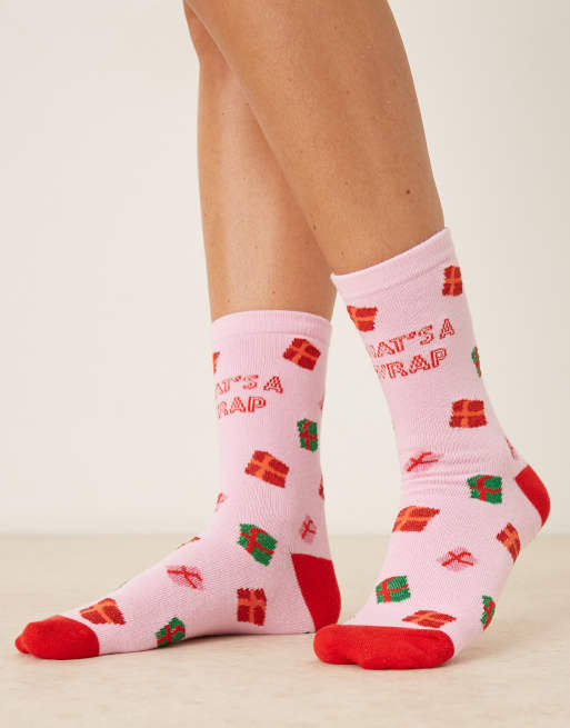 Accessorize – Weihnachten – Socken in Rosa mit Geschenke-Print und „That's A Wrap“-Schriftzug