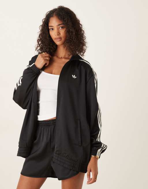 adidas Originals – Satin-Trainingsoberteil in Schwarz mit drei gerüschten Streifen