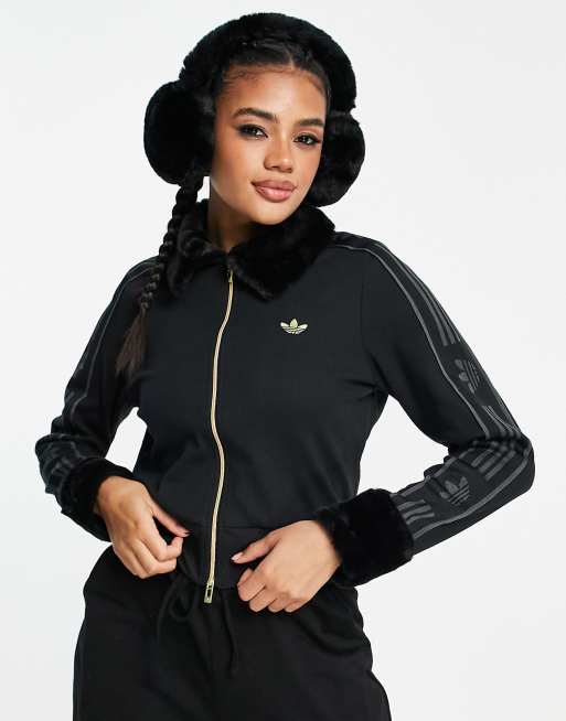adidas Originals – Ski Chic – Geripptes Trainingsoberteil in Schwarz mit flauschigem Besatz