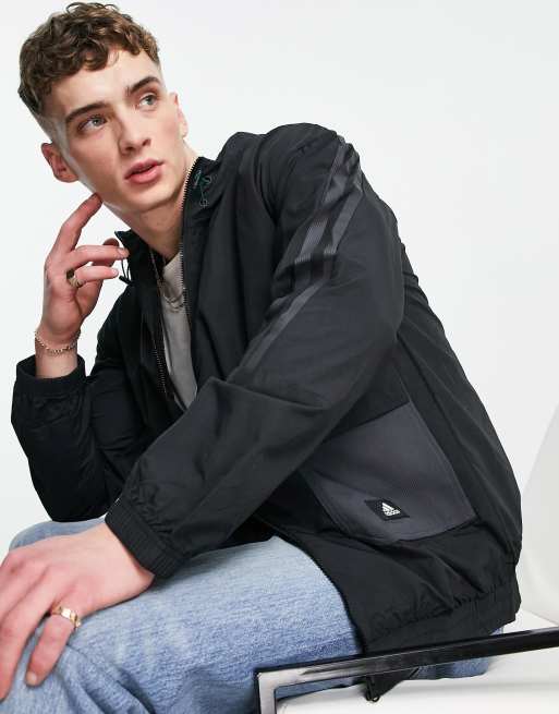 adidas Sportswear – Gewebte Kapuzenjacke in Schwarz mit farblich abgestimmten drei Streifen
