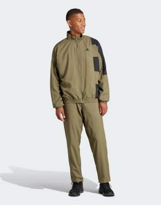 adidas Sportswear – Trainingsanzug in Grün mit Blockfarbendetails