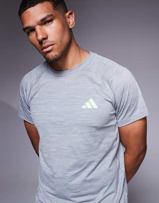 adidas Training – Gym+ – T-Shirt in Grau mit grünem Farbakzent und 3-Streifen-Design