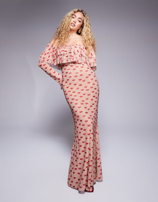 AFRM – Dahlia – Schulterfreies Maxikleid in Mandelfarbe mit Rüschen und Kuss-Print