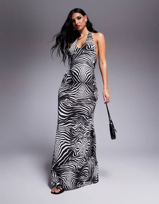 AFRM – Rue – Neckholder-Maxikleid aus glänzendem Strick mit Zebra-Wirbelmuster