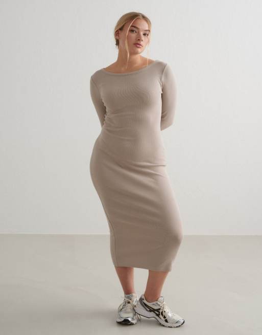 Aim'n – Ease – Geripptes, langärmliges Kleid in dunklem Lehmbeige