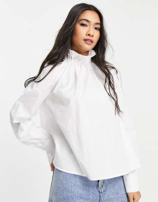 Aligne – Baumwoll-Bluse in Weiß mit gerüschtem Stehkragen - WHITE