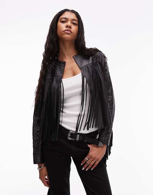 AllSaints – Asta – Western-Lederjacke in Schwarz mit Fransen