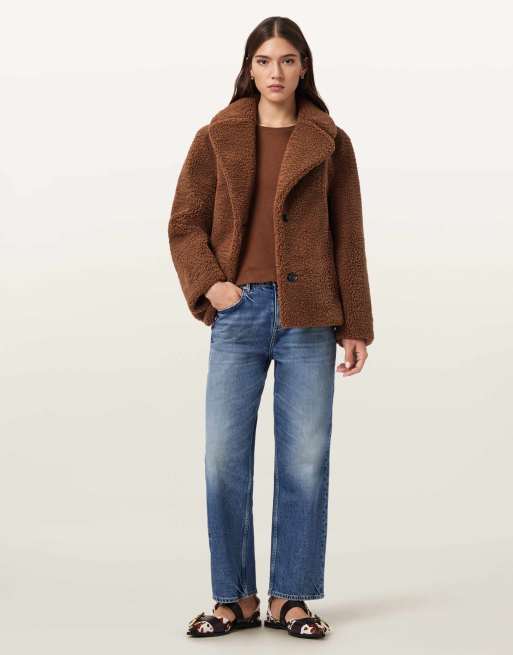 AllSaints – Eddie – Jacke aus Kunstpelz in Cognacbraun
