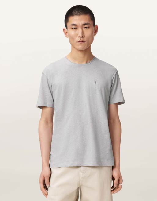 AllSaints – Flax – Kurzärmliges T-Shirt in Kieselgrau mit Rundhalsausschnitt