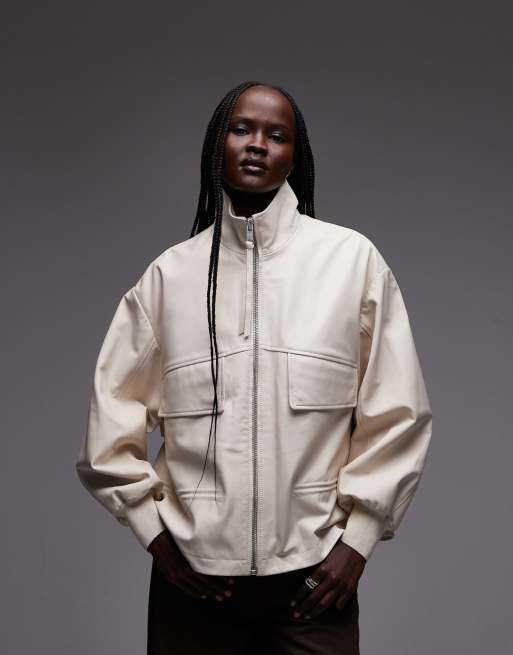 AllSaints – Flor – Hochgeschlossene Bomberjacke aus Leder in Cremeweiß
