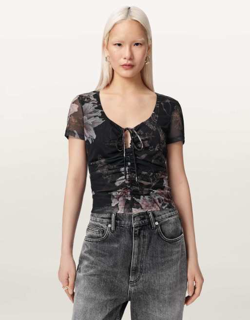 AllSaints – Gabby – Netzstoff-Oberteil in Kristallschwarz