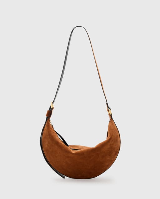 Allsaints – Halbmondförmige Schultertasche aus Wildleder in Cognac-Braun