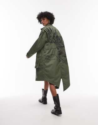 AllSaints – Milla – Parka in Khakigrün mit Vogel-Motiv
