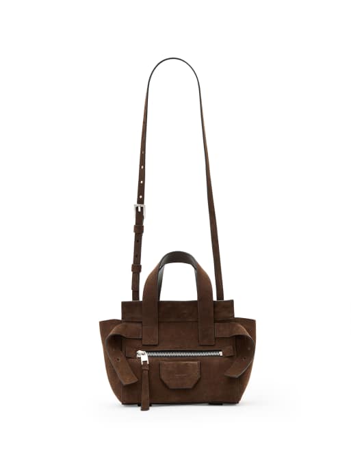 AllSaints – Perez – Mini-Tasche aus Wildleder in Fango-Braun