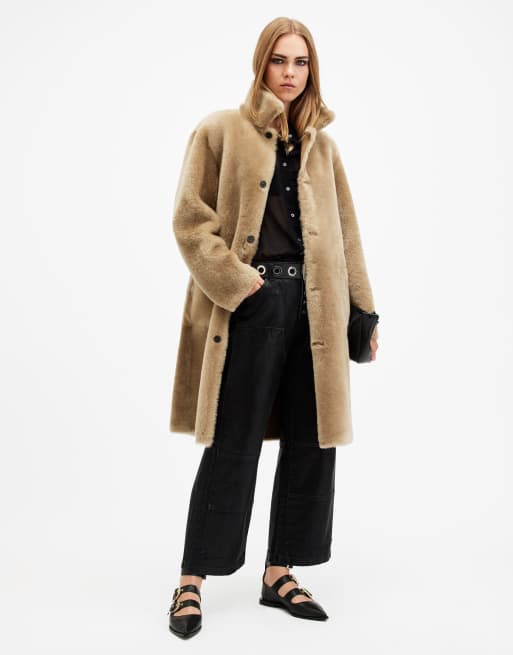 AllSaints – Serra – Lammfellmantel in Taupe-Braun