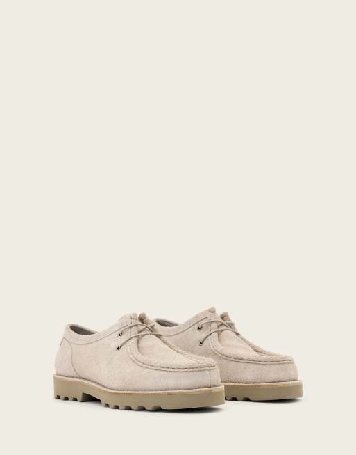 AllSaints – Skiff – Geschnürte Bootsschuhe aus Leder in Braun mit Kuhfellmuster