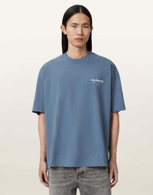 AllSaints – Underground – Kurzärmliges T-Shirt in Mayablau mit Rundhalsausschnitt