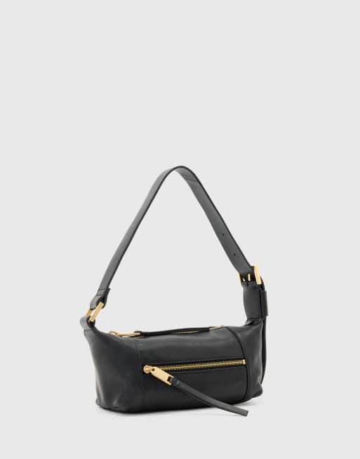 AllSaints – Vega – Mini-Schultertasche aus Leder in Schwarz