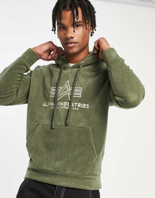 Alpha Industries – Kapuzenpullover aus Polarfleece in dunklem Olivgrün mit Logo vorne