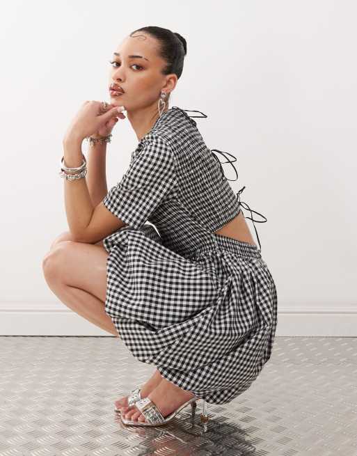 Amy Lynn – Gesmoktes Minikleid mit Schößchen, Bindebändern hinten und Vichykaromuster in Schwarz/Weiß