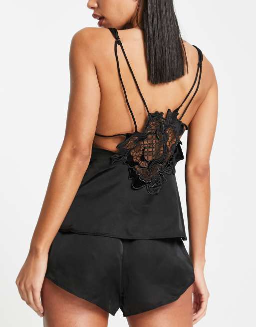 Ann Summers – Amaya – Set mit Camisole und Shorts aus Satin mit floraler Samtapplikation in Schwarz