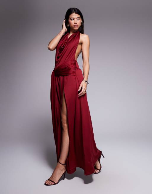Aria Cove – Anschmiegsames Maxikleid in Burgunderrot mit Wasserfallausschnitt, Rückenausschnitt, drapierter Vorderseite und hohem Schlitz