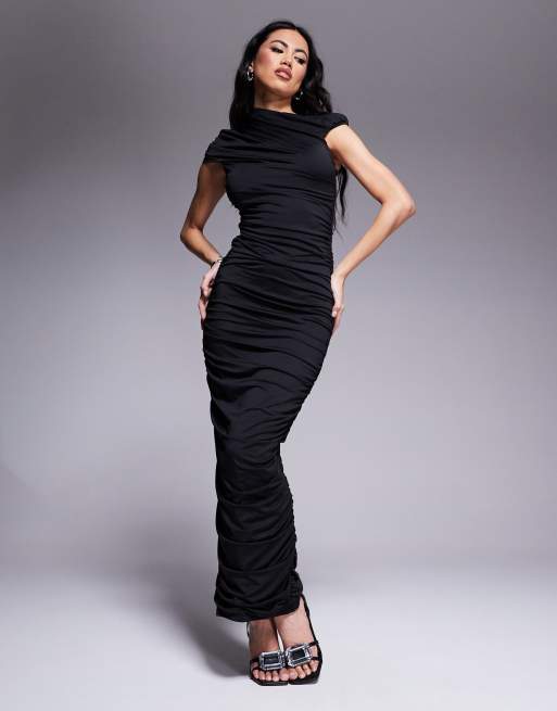 Aria Cove – Doppellagiges und figurbetontes Maxikleid in Schwarz mit Off-Shoulder-Träger und Raffung