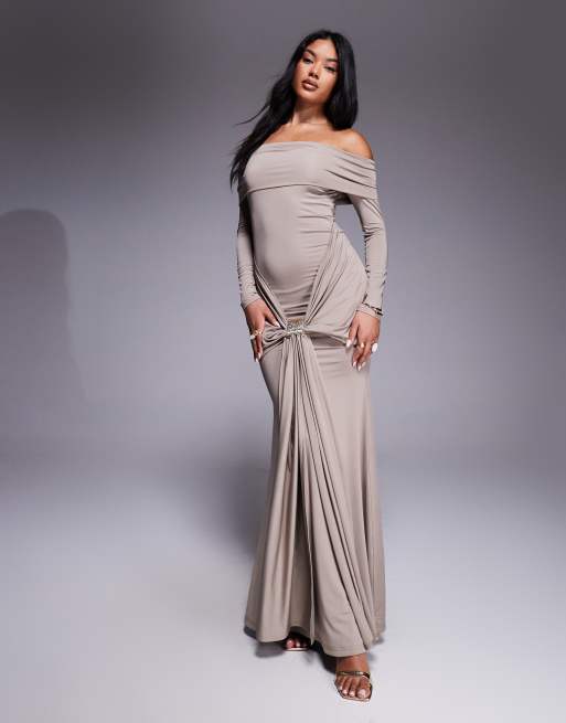 Aria Cove – Maxikleid in Sanftbraun mit tiefem Carmen-Ausschnitt, goldfarbenem Metalldetail und Drapierung vorne