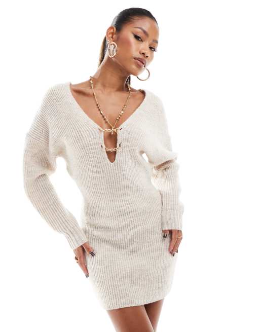 Aria Cove – Mini-Pulloverkleid aus Rippstrick in Beige mit tiefem Ausschnitt mit Kettendetails