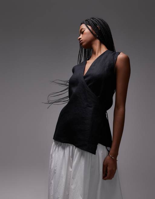ARKET – Ärmellose Hemdbluse aus schwarzem Leinen mit gebundener Wickelfront