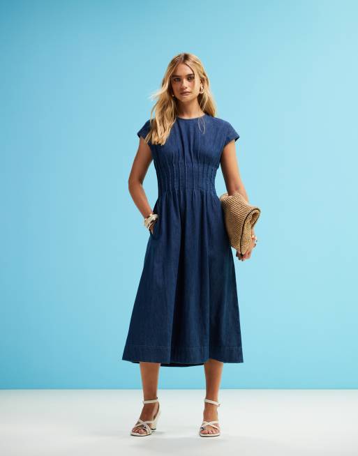 ARKET – Leichtes Midikleid aus Denim in mittelblauer Waschung mit plissiertem Oberteil